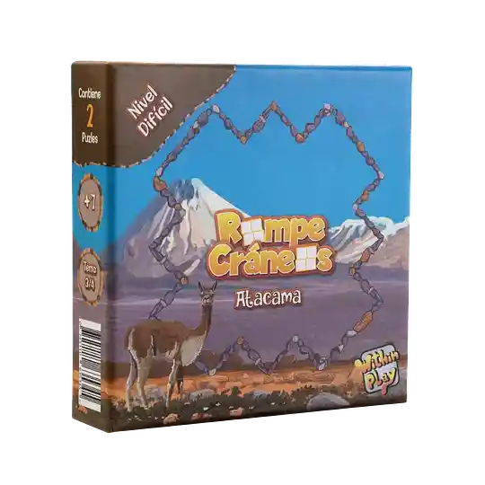Atacama: El desierto más seco del mundo, pero no por eso un lugar sin vida. Aquí encontramos hermosos animales como el zorro chilla, la vizcacha, el armadillo peludo o la vicuña, pero también algunos interesantes reptiles como el dragón de Stolzmann, el lagarto de atacama o la lagartija de cabeza negra. Una cara del puzle está inspirada en mamíferos y la otra, en reptiles. Rompe Cráneos es un set coleccionables de puzles de ingenio ambientados en distintos ecosistemas de Chile, utilizando distintos representantes de la flora y fauna nativa. Estos puzles son un verdadero desafío mental, que pondrán a prueba las habilidades razonamiento lógico, espacial y abstracto. ¡Vas a echar humo por la cabeza! Cada juego ecosistema representa un nivel de dificultad distinto, desde el medio hasta el nivel experto. ¡Cómo Jugar? Arma el marco por uno de los dos lados y ubica dentro de él, las doce piezas cuadradas, haciendo coincidir la parte superior e inferior de cada especie. Habrán piezas que pareciera que calzan más de un lugar, pero la verdad es que hay solo una solución correcta, por lo que debes idear bien tu estrategia para encontrarla.