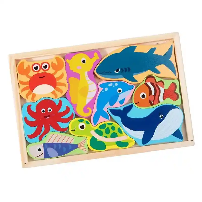 Material: Madera. Apto para edades: Entre 3 y 6 años. Medida: 22 cm x 14,6 cm (aprox). Diseños: Animales Marinos Contiene: 1 tabla base y 9 piezas de rompecabezas. . Es ideal para estimular el aprendizaje temprano de una manera divertida y segura. . Promueve el desarrollo de habilidades cognitivas, motoras y sensoriales mientras juegan. . Aprenderán a reconocer formas y colores, pueden mejorar la coordinación mano-ojo. . Ayuda a estimular el pensamiento lógico, la concentración y resolver problemas como lo es encajar cada pieza en su lugar. . Es perfecto para actividades Montessori, uso en salas cuna y jardines infantiles, así como para juegos guiados de psicomotricidad y juego educativo en casa.