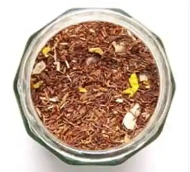 Rooibos (te rojo sudafricáno) con limón, pedacitos de manzana, coco, lemongrass y pétalos de girasol, además de aroma de yogurt