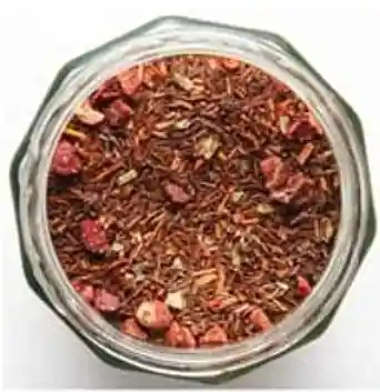 Rooibos (te rojo sudafricáno) con pedacitos de frutilla, hojas, aceite de cártamo y aroma de crema