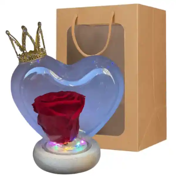 ROSA PRESERVADA CUPULA CORAZON, CON LUCES, CORONITA Y BOLSA REGALO