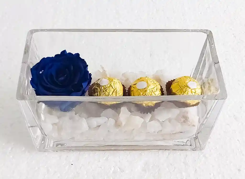 1 Rosa Preservada en Florero Rectangular y 3 Bombones Ferrero Rocher