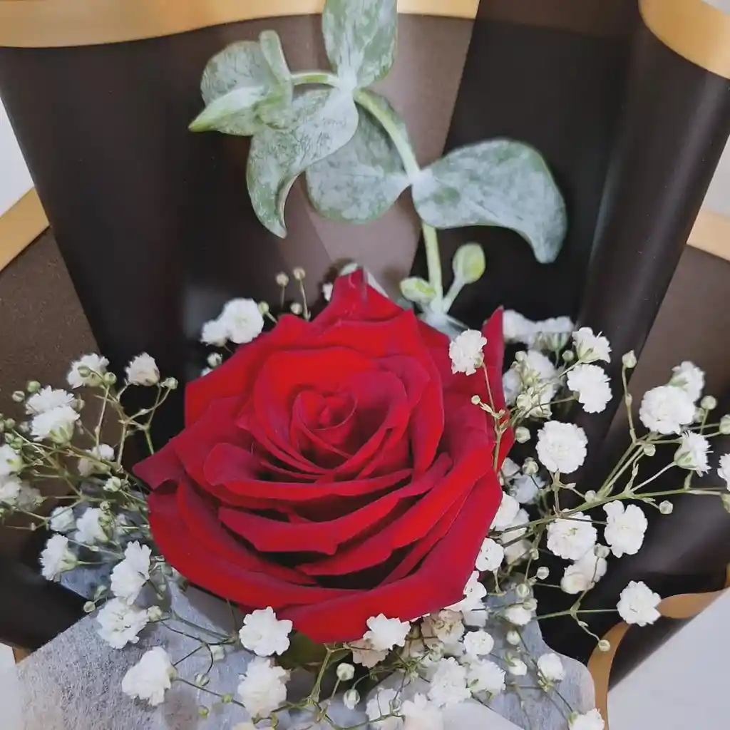 Elegante rosa roja, acompañada de follaje (sujeto a stock). Envuelto en papel decorativo con lazo.