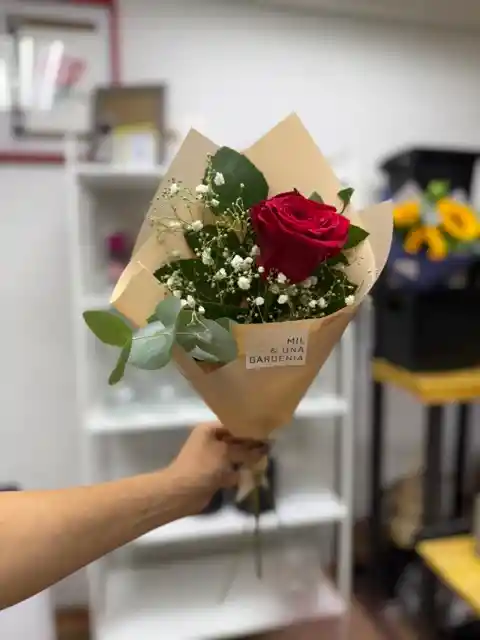 Una rosa roja acompañada de verde de temporada, envuelta en papel a combinación.