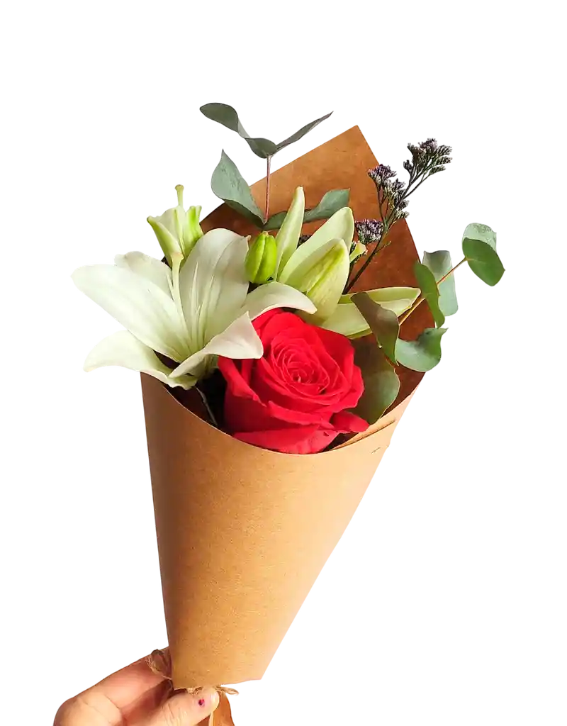 Una vara de rosa más una vara de Lilum acompañadas de follaje. Los tonos de las flores pueden variar dependiendo de la disponibilidad de flores del mercado.