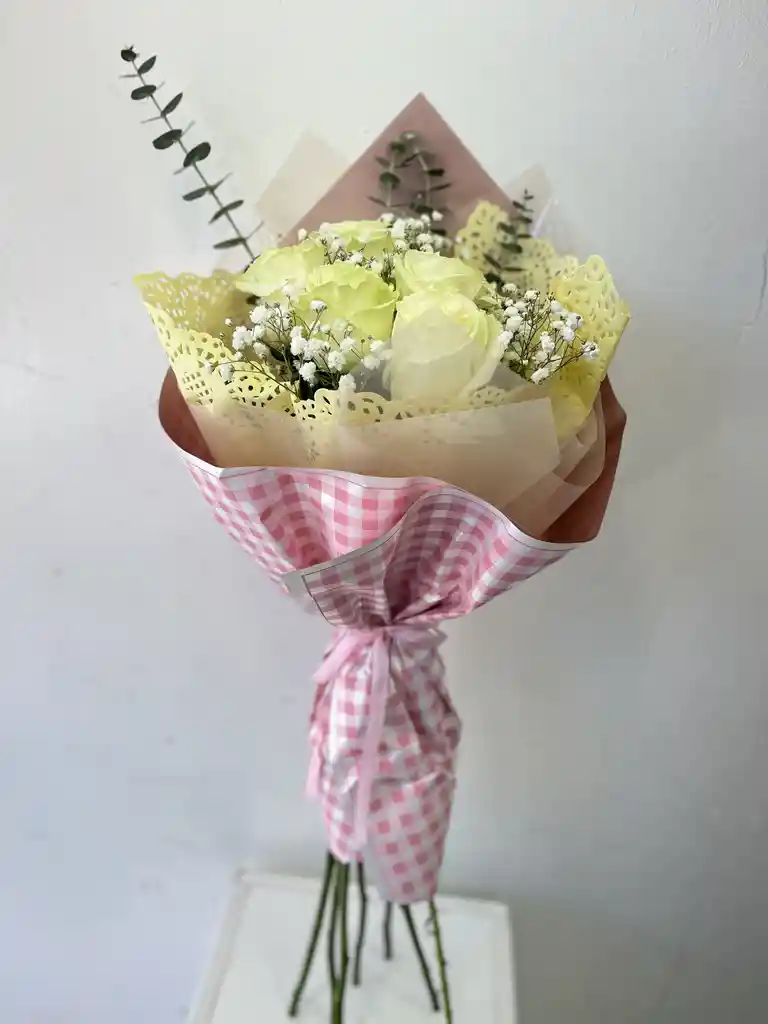 Delicado ramo de Rosas Blancas Incluye: - 6 Rosas Blancas Ecuatorianas envueltas en delicado papel Coreano - Gipsophilia - Follaje de estación - Tarjetita de mensaje