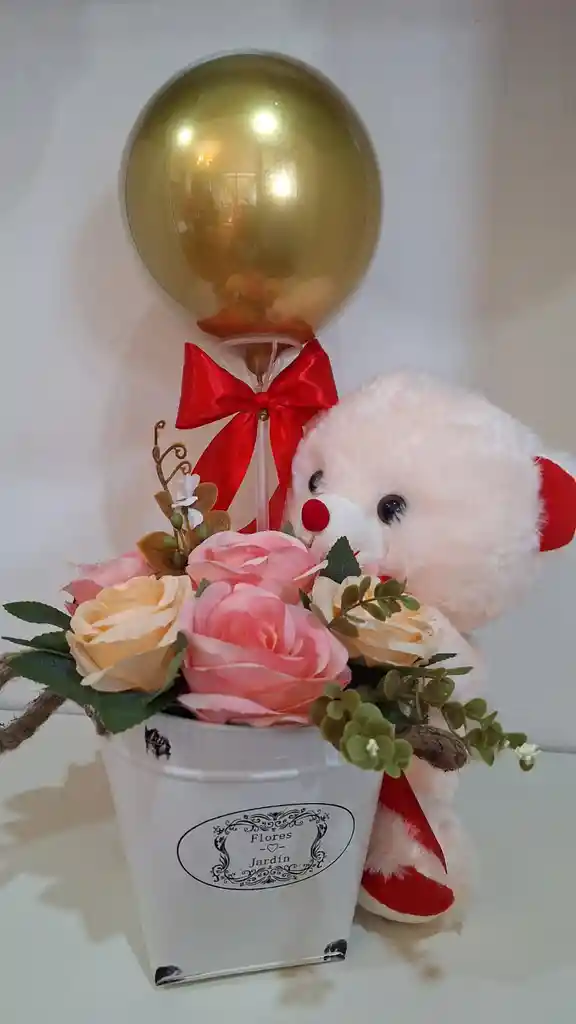Adorable oso de peluche de 30 cm, abrazando un balde metálico decorado con rosas artificiales y globo.
