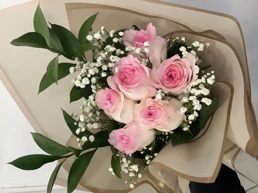 Hermoso Ramo de rosas rosadas con gipsophilia y follaje de estación