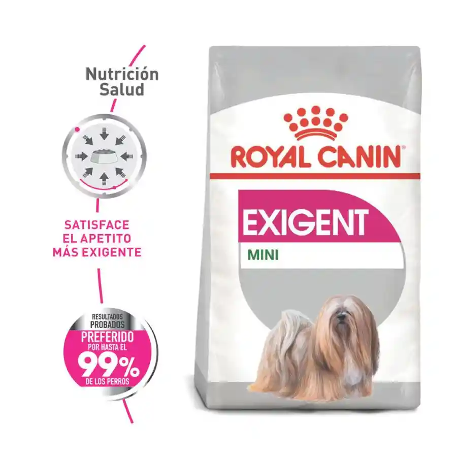 Alimento para perros mini Royal Canin Exigent Mini Con el alimento para perros mini Royal Canin Exigent Mini los problemas de inapetencia de tu mascota serán cosa del pasado. Especialmente preparado para perros adultos de razas pequeñas con un paladar exigente, este pienso tiene un sabor y aroma irresistibles que le harán la boca agua a tu mascota. Gracias a la textura de las croquetas, crujientes por fuera y blandas por dentro, a tu mascota le encantarán. Además de delicioso, el alimento para perros mini Royal Canin Exigent Mini también es nutritivo. Su fórmula rica en proteínas fortalece los músculos de tu perro mientras que los ácidos grasos omega 6 cuidan su piel y le aportan brillo y suavidad al pelo. Este alimento para perros también previene la formación de sarro en los dientes para cuidar la salud dental de tu mascota. Características: Alimento para perros de razas mini con paladares exigentes. Textura crujiente por fuera y blanda por dentro. Fórmula rica en proteínas y omega 6. Aroma y sabor irresistible. Aporta un extra de brillo y suavidad al pelo. Detalles del producto: Indicado para perros adultos, a partir de 10 meses, y de tamaño pequeño, entre 1 y 10 kilos.