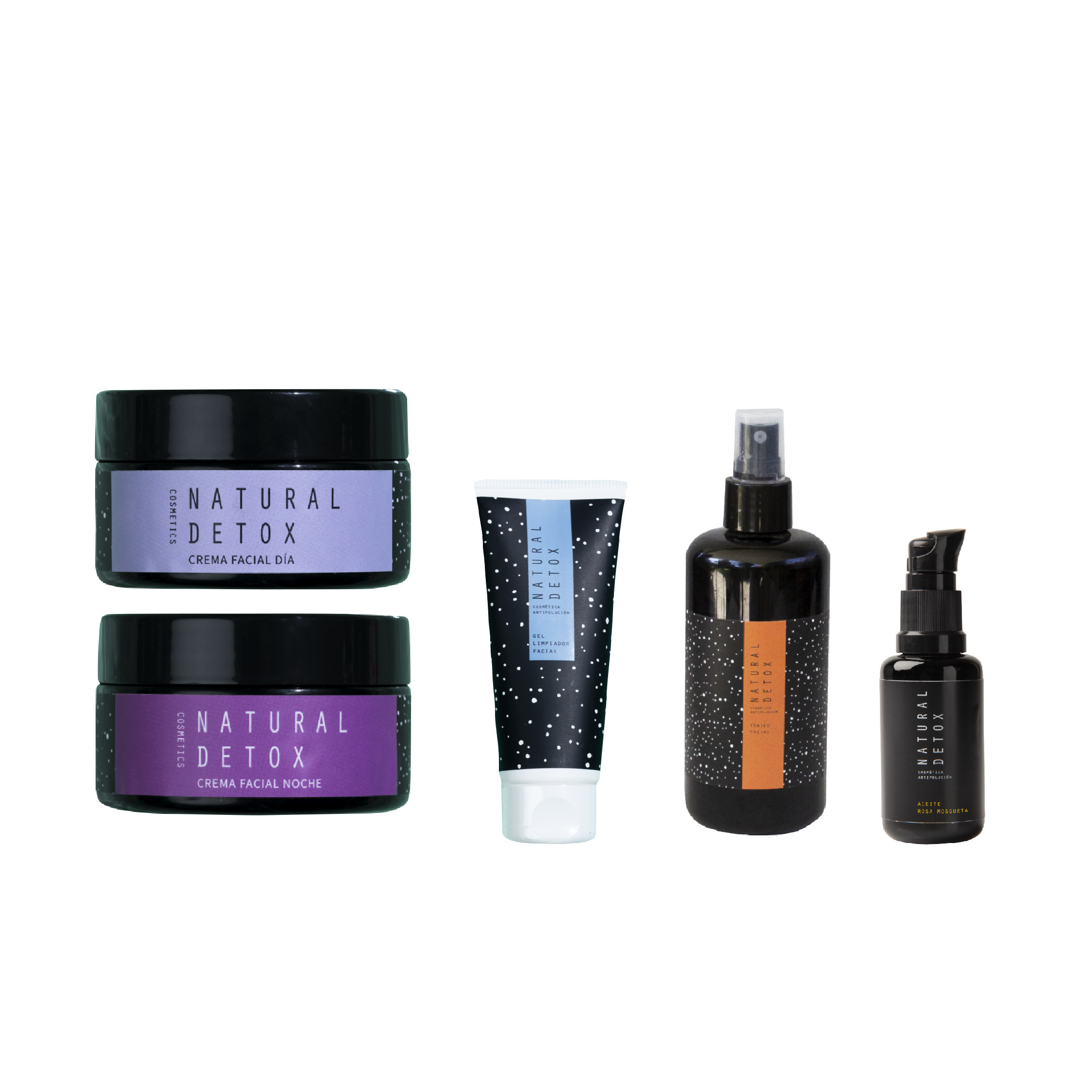 Tener una rutina de cuidado facial es fundamental para el correcto funcionamiento de la piel y para lucirla saludable, bella e iluminada. Esta es una rutina facial Detox, repleta de antioxidantes e ingredientes rejuvenecedores que mantendrán tu piel libre de manchas, arrugas y líneas de expresción.Aquí encuentras todos los pasos esenciales para tu piel, tanto para el día y para la noche.¿Qué trae esta rutina? Gel limpiador 100 ml: Es el primer paso de la rutina. Debes aplicarlo en la noche y el día con el rostro húmedo y luego enjuagar.Exfoliante 100 ml: Una vez a la semana aplica el exfoliante después del gel limpiador y enjuaga.Tónico facial 200 ml: Con la piel limpia y seca aplica el tónico facial directamente sobre el rostro y espera a que se absorba. Aceite de Rosa Mosqueta 30 ml: Este paso va únicamente en las noches. Con el rostro seco, aplica en todo el rostro y masajea hasta que se absorba. Crema facial de día 50 ml: Luego del tónico facial aplica esta crema y tu rutina de cuidado facial ya está lista.Crema facial de noche 50 ml: Después del aceite de rosa mosqueta aplica esta crema facial en todo tu rostro y cuello. Espera a que se absorba y tu rutina de cuidado facial nocturna está lista.BeneficiosSi eres constante, a los 7 días verás los primeros cambios en tu piel. Sintiendo que está más hidratada, con el tono uniforme y más deshinchada. En un mes estos cambios serán permanentes y notorios.