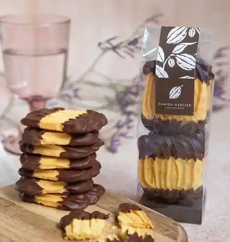 Dualidad de texturas en esta excepcional galleta de vainilla natural a la mantequilla untada en chocolate amargo. Peso: 115 grs / Sin azúcar adicionada