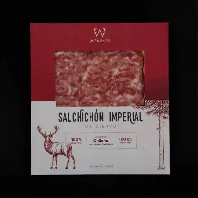 Salchichón Imperial de Ciervo Desde Villarrica, un embutido noble que une carne de ciervo y grasa de jabalí con una mezcla de especias tradicionales: pimienta negra, orégano, paprika, mejorana, comino y ajo. Curado con paciencia y maestría, entrega un sabor intenso, elegante y silvestre, ideal para tablas de charcutería y maridajes con vinos robustos.