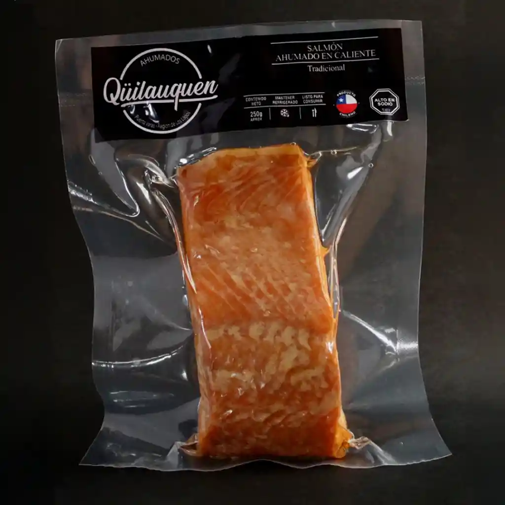 <p>Descubre la exquisitez y la suavidad del Salmón Ahumado en Caliente Quilauquén, cuidadosamente preparado y ahumado para realzar su sabor único. Este salmón, obtenido de aguas frías y puras, se presenta en finas lonchas listas para disfrutar en cualquier ocasión. Rico en Omega-3 y perfectamente condimentado, es ideal para ensaladas, canapés o simplemente como un delicioso tentempié. Cada paquete contiene 250g de salmón, ahumado utilizando métodos tradicionales que garantizan su frescura y calidad superior.</p> <p><strong>Características</strong>:</p> <ul> <li> <strong>Peso</strong>: 250 g.</li> <li> <strong>Conservación</strong>: Mantener refrigerado.</li> <li> <strong>Consumo</strong>: Ideal para consumo directo o como parte de aperitivos gourmet.</li> </ul> <p>Disfruta de un toque de sofisticación en tu mesa con el Salmón Ahumado <meta charset="utf-8">en Caliente Quilauquén, un producto que combina tradición y calidad para los paladares más exigentes.</p> <p><img></p>
