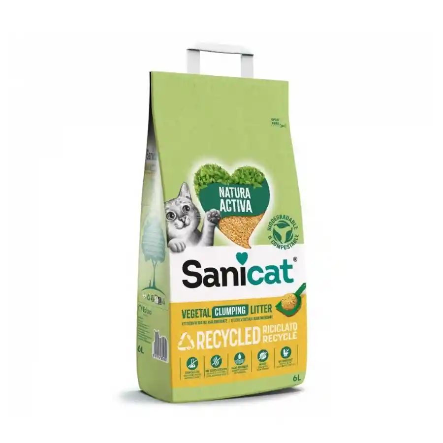 Sanicat Natura Activa Recycled es una arena aglomerante reciclada, de origen natural, biodegradable y compostable. Procede de la recuperación de residuos no alimentarios de la industria del cultivo del maíz. Forma aglomerados para fácil de limpiar y neutraliza los malos olores de forma natural, lo que permite que la arena esté limpia durante más tiempo. No genera polvo y su textura de grano fino la hace suave al tacto para las patitas sensibles. Además, no contiene colorantes, perfumes ni ingredientes nocivos añadidos y su origen natural se conserva al 100 %. 1. REUTILIZACIÓN DE RESIDUOS NATURALES, FUENTES NATURALES Y CERTIFICADAS 2. TRANSFORMACIÓN EN UNA ARENA NATURAL PARA GATOS 3. ENVASE RECICLABLE Y SIN PLÁSTICO 4. MATERIA PRIMA BIODEGRADABLE Y COMPOSTABLE