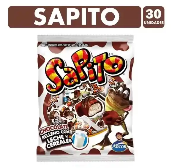 Delicioso chocolate Sapito relleno con leche y cereales. Estos chocolates son los favoritos de los pequeños de la casa, pero los grandes los disfrutan gracias a su inigualable y clásico sabor y textura. Esta bolsa contiene 30 unidades y cada una cuenta con una envoltura individual que mantiene todo su sabor y frescura y las hace ideales para llevarlas a donde tú quieras. Este clásico de clásicos podrás compartirlo con tus amigos o familia y tener un grato momento, sobre todo con los amantes de los dulces. Todos nuestros productos tienen una frescura inigualable ya que renovamos constantemente nuestro stock. Además, cuentan con envasado y sellado de fábrica que permiten conservar el producto fresco e ideal para tu consumo.