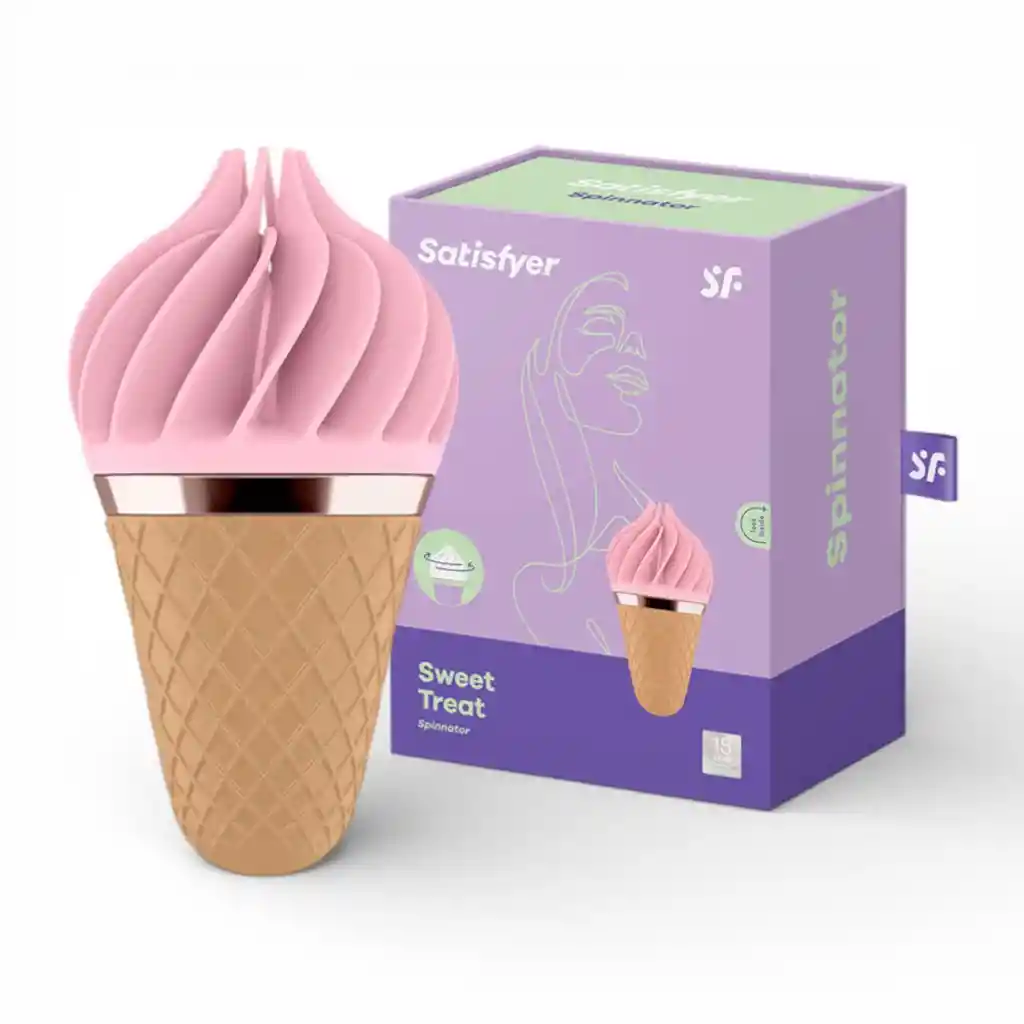 El Satisfyer Sweet Treat es probablemente el más dulce de todos los vibradores para clítoris, ya que la bola de helado sobre el discreto croissant lo tiene todo: Con sus láminas giratorias, tu clítoris llegará a unos orgasmos súper dulces nunca antes imaginados. La silicona, deliciosamente suave y agradable a la piel, envuelve la perla de placer y cuida de tu bienestar sexual con una gran devoción, sin importar dónde estés. El seductor cono se adapta cómodamente a la mano, de modo que puedes controlar fácilmente los 10 emocionantes niveles de vibración, que constan de 4 ritmos de rotación y 3 velocidades de derecha e izquierda cada uno, a través de los botones +/-. Características: Color: Rosa / Marrón. Material: Plástico ABS, Silicona. 11 programas de vibración y rotación. Modo de susurro. Cable USB magnético incluido. Resistente al agua (Sumergible). Estimulación del clítoris mediante potente vibración. Largo: 10,4 cm. Ancho: 5,6 cm. Peso: 84 gr.