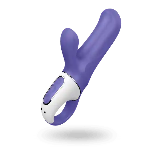 Su vibración extra intensa estimula al mismo tiempo tu punto G y tu clítoris: directamente sin red 2 potentes motores Este compacto juguete erótico de silicona flexible es una sorpresa muy dulce que Satisfyer Vibes saca ahora de la chistera: Magic Bunny tiene una excelente habilidad para proporcionarte orgasmos inimaginables estimulando al mismo tiempo el punto G y el clítoris. ¡Puede parecer pequeño e inocente, pero detrás de sus orejas se oculta toda la potencia de este conejo, que con 2 potentísimos motores y 12 programas de vibración, te hará sentir toda su magia! Y qué gran fortuna el tamaño compacto de Magic Rabbit, que le convierte en el compañero de viaje ideal. Así no lo sacarás de la chistera, pero sí que podrás sacarlo del bolso cada vez que te asalte la lujuria. En el práctico anillo de sujeción con panel de mando encontrarás de manera intuitiva las vibraciones que más te gustan simplemente pulsando un botón, mientras sujetas con firmeza este simpático conejito incluso en los momentos más húmedos e intensos. Los 12 programas de vibración, especialmente potentes, se componen de 6 intensidades y 6 ritmos celestiales. Los 2 motores distribuyen las vibraciones por todo el tallo y el estimulador del clítoris, por lo que proporciona una intensa estimulación por todo tu cuerpo. El acabado impermeable (IPX7) del Magic Bunny te invita también a disfrutar de momentos de placer en la ducha o la bañera. Vibración profunda super intensa Cuerpo flexible e impermeable Suave silicona maciza de alta calidad Cargador magnético Detalle del producto Peso: 207 g Longitud: 178 mm Anchura: 82 mm Altura: 39 mm Material: Plástico ABS, Silicona Color: Azul Resistente al agua: Sí Las baterías de tu nuevo juguete favorito permiten recargarlo y respetar el medio ambiente. Si quieres recargar tu juguete en la red, puedes completar el cable magnético USB con un enchufe convencional de 5 V.