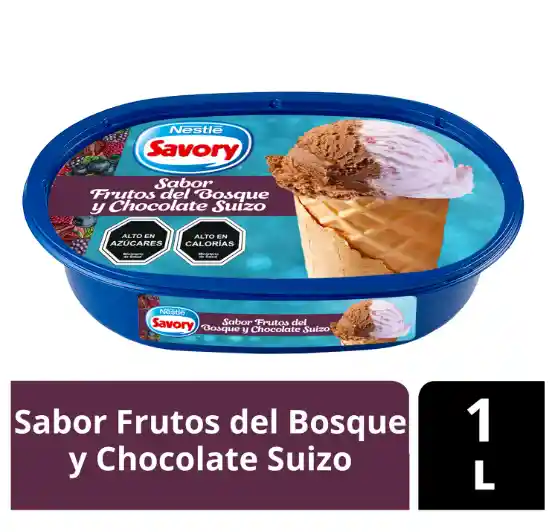 El Helado Savory Sabor Chocolate Suizo y Frutos del Bosque 1 L es una crema helada que combina una base cremosa de chocolate suizo con la acidez de los frutos del bosque, a menudo incluyendo trozos de almendras.