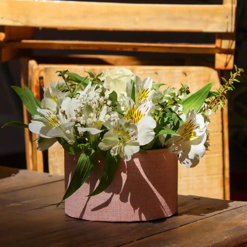 Delicada presentacion de flores en cajita redonda, para un lindo regalo