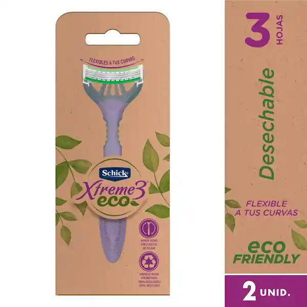 Schick Xtreme 3 Women Eco Protege Tu Piel y Protege Al Planeta. Mango Hecho de Plastico Reciclado, Empaque 100% Recicable, 3 Hojas Flexibles y Banda Lubricante Con Aloe