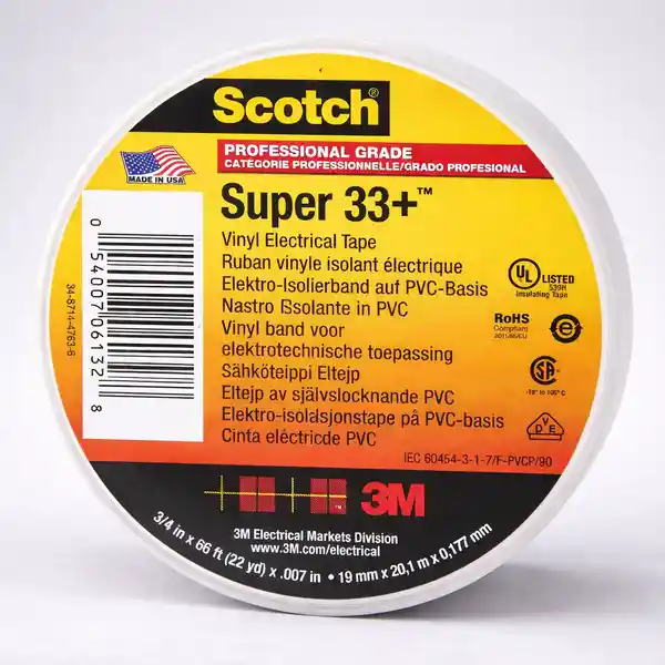 Aisladora Vinílica Eléctrica Scotch Super 33 + de Alta Calidad Ideal Para Aislamiento Eléctrico en Proyectos de Construcción. Con Una Longitud de 201 Metros y Grosor de 0177 mm Garantiza Una Excelente Resistencia y Durabilidad en Instalaciones Eléctricas Profesionales. Confía en la Marca Líder Para Tus Proyectos!.