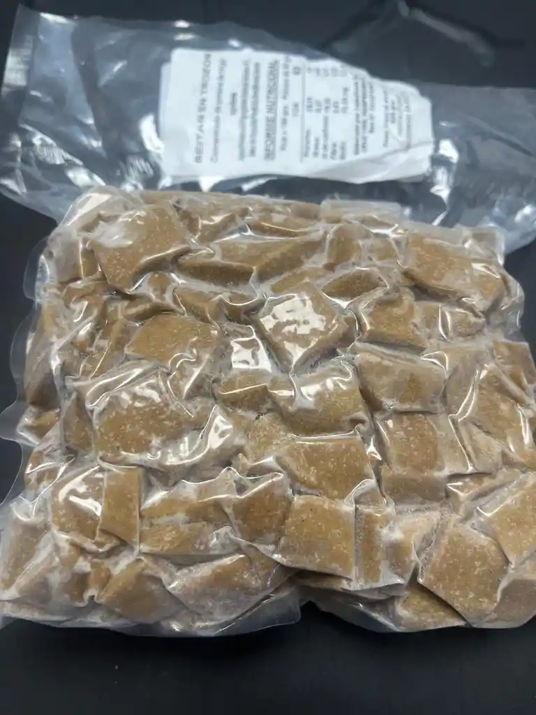 El Seitán en Trozos una alternativa proteica 100% vegetal, ideal para diversas preparaciones, basadas en salteados y guisos. Ingredientes: Agua, proteina de trigo(gluten), harina de garbanzo 5%, salsa de soya,sal,perejil,ajo,nuez mozcada, cebolla