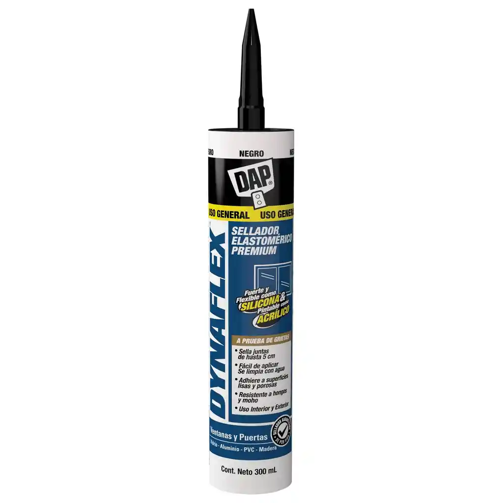 Sellador Elastomerico Premium DYNAFLEX Negro Cartucho 300ml. Sellador elastomerico de latex de primera calidad para uso general, formulado a base de polimeros modificados de avanzada con una resistencia similar a la silicona. Combina la excepcional durabilidad, flexibilidad y adhesion de las siliconas con la facilidad de aplicacion, bajo olor, limpieza con agua y posibilidad de ser pintado de los acrilicos. Es altamente flexible para manejar el movimiento de juntas ocasionado por las variaciones en la temperatura y la humedad sin agrietarse. Brinda un sellado duradero que es 100% a prueba de agua e intemperie. Ideal para sellar fugas de aire alrededor de ventanas y puertas. Ofrece la performance de las siliconas aceticas no industriales. Fuerte como la silicona: Flexibilidad y performance superior a prueba de grietas. Pintable luego de dos horas*. Sella juntas de hasta 5 cm. Sellado 100% a prueba de agua e intemperie. Facil de aplicar. Se limpia con agua y tiene bajo olor. Adhiere a superficies lisas y porosas. Resistente a hongos y moho. Uso interior y exterior