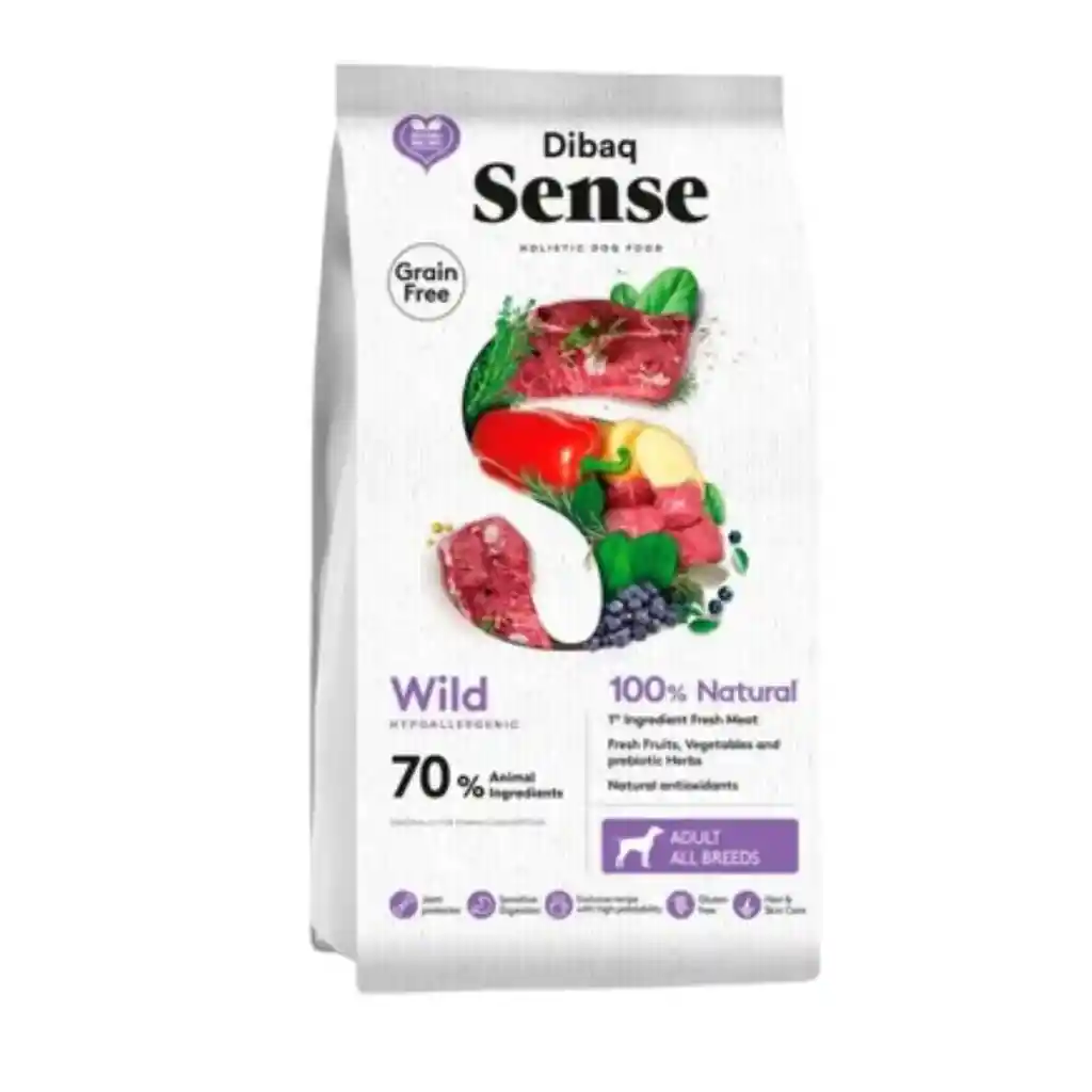 Alimento hipoalergénico para perros adultos de todas las razas elaborado con carnes frescas de ciervo y jabalí, pimientos, arándanos y manzana. Receta hipoalergénica elaborada sin cereales y sin pollo para prevenir intolerancias a estas proteínas. Nuestra receta incluye carnes frescas de ciervo y jabalí, cuidadosamente seleccionadas para proporcionar una fuente de proteínas de alta calidad. Además, hemos incorporado una variedad de ingredientes saludables como arándanos, pimientos y manzanas frescas, ricos en vitaminas, minerales y antioxidantes naturales que contribuyen a la salud general de tu mascota. Esto hace que Dibaq Sense Grain Free Wild sea el mejor pienso sin gluten para perros con intolerancia a los cereales o carnes de pollo. Para cuidar las articulaciones de tu perro, hemos añadido protectores articulares que promueven la flexibilidad y la movilidad. También hemos incluido plantas prebióticas para mejorar la digestión y mantener un equilibrio saludable de la flora intestinal. Nuestro pienso está formulado específicamente para perros intolerantes al gluten y al pollo, ya que está libre de cereales y de cualquier derivado de pollo, lo que lo convierte en una opción segura y nutritiva para perros con sensibilidades alimentarias. En Dibaq, nos enorgullece ofrecer una alimentación de alta calidad que satisfaga las necesidades nutricionales de tu mascota, mientras cuidamos el medio ambiente y apoyamos a los productores locales. Nuestro compromiso con la sostenibilidad se refleja en nuestros envases de papel reciclado con certificación FSC, así como en nuestras prácticas de producción responsables. ¡Dale a tu perro el mejor cuidado con Dibaq! Composición Jabalí fresco 20%*, ciervo fresco 20%*, pavo deshidratado 20%, guisantes pelados*, patata, almidón de guisante, aceite de pavo 9%, pulpa de remolacha (fuente de fibra), verduras y frutas frescas 4% (pimiento, arándanos y manzana), Ceratonia siliqua* , aceite de salmón 1% (fuente de ácidos grasos omega 3 y 6), sustancias minerales, pack protectores articulares (Condrotina sulfato 750 mg/kg, glucosamina clorhidrato 750 mg/kg y MSM), yuca, raíz de achicoria (fuente de inulina-FOS), levaduras (MOS) y plantas aromáticas con propiedades antioxidantes naturales (romero*, tomillo* y orégano*).*Ingredientes 100% naturales. Componentes analíticos Proteína bruta 26%, Grasa bruta 15%, Fibra bruta 2,8%, Materia Inorgánica 5,9%, Vitamina A 18.000 UI/kg, Vitamina D3 1.800 UI/kg, Vitamina E (acetato de todo - rac α- tocoferol) 100 mg/kg, Ca 1,2%, P 0,85%, Na 0,11%. E.M. 3.665 kcal/kg. Aditivos Aditivos nutricionales/kg Oligoelementos Hierro 137 mg (como carbonato de hierro (II)), Yodo 1,8 mg (como yodato de calcio anhidro), Cobre 11 mg (como sulfato de cobre (II) pentahidratado), Manganeso 33 mg (como óxido de manganeso (II)), Zinc 175 mg (como óxido de zinc), Selenio 0,25 mg (como selenito sódico).Aditivos tecnológicos Conservantes (extractos de cítricos) y antioxidantes (tocoferoles naturales).