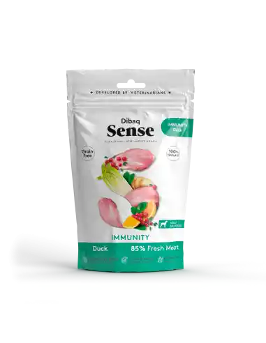 Dibaq Sense Snack Inmunity es un Snack semi húmedo elaborado con carnes frescas de pato y pavo, patata y arándanos rojos frescos. Ingredientes naturales que contribuyen a reforzar su sistema inmunológico. Dibaq Sense Snack son unos premios desarrollados por veterinarios que ayudan a mantener el bienestar de las mascotas con unas recetas funcionales sin cereales que previenen alergias o intolerancias. Envase Doy Pack con cierre Zip que ayuda a mantener la calidad y frescura de los mismos. Dibaq Sense, es una gama hipoalergénica de productos naturales para perros y gatos. Recetas sin cereales y carnes frescas como primer ingrediente. Composición Pato fresco 70%*, pavo fresco 15%*, patata, glicerina vegetal, arándanos rojos frescos 1%*, extractos cítricos 0,5%, Saccharomyces cerevisiae (Fuente de MOS) 0,25%, achicoria (Fuente de FOS) 0,25%. *Ingredientes naturales. Componentes analíticos Proteína bruta 22%, Grasa bruta 13%, Fibra bruta 1,7%, Materia inorgánica 5%, Humedad 16%. Energía metabolizable 3.742 Kcal/kg. Aditivos Aditivos tecnológicos: Conservantes y antioxidantes naturales (Extractos de tocoferoles).