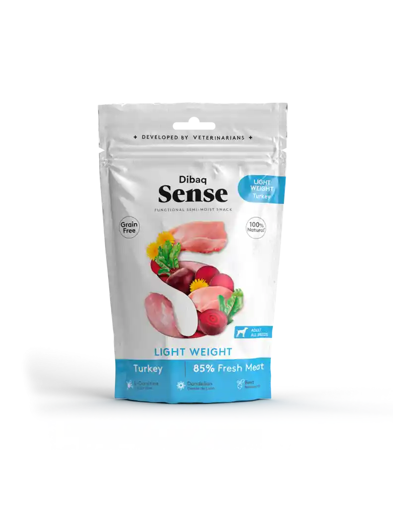 Dibaq Sense Snack Light Weight es un Snack semi húmedo elaborado con carnes frescas de pavo, patata, remolacha y diente de león. Ingredientes naturales que ayudan a mantener el peso y además está enriquecido con L-Carnitina que favorece la transformación de grasa en energía. Dibaq Sense Snack son unos premios desarrollados por veterinarios que ayudan a mantener el bienestar de las mascotas con unas recetas funcionales sin cereales que previenen alergias o intolerancias. Envase Doy Pack con cierre Zip que ayuda a mantener la calidad y frescura de los mismos. Dibaq Sense, es una gama hipoalergénica de productos naturales para perros y gatos. Recetas sin cereales y carnes frescas como primer ingrediente. Composición Pavo fresco 85%*, patata, glicerina vegetal, remolacha 1%*, diente de león 0,55%. *Ingredientes naturales. Componentes analíticos Proteína bruta 20%, Grasa bruta 11%, Fibra bruta 1,6%, Materia inorgánica 3,4%, Humedad 19%. Energía metabolizable 3.590 Kcal/kg Aditivos L-Carnitina: 2.500 mg/kg. Aditivos tecnológicos: Conservantes y antioxidantes naturales (Extractos de tocoferoles).
