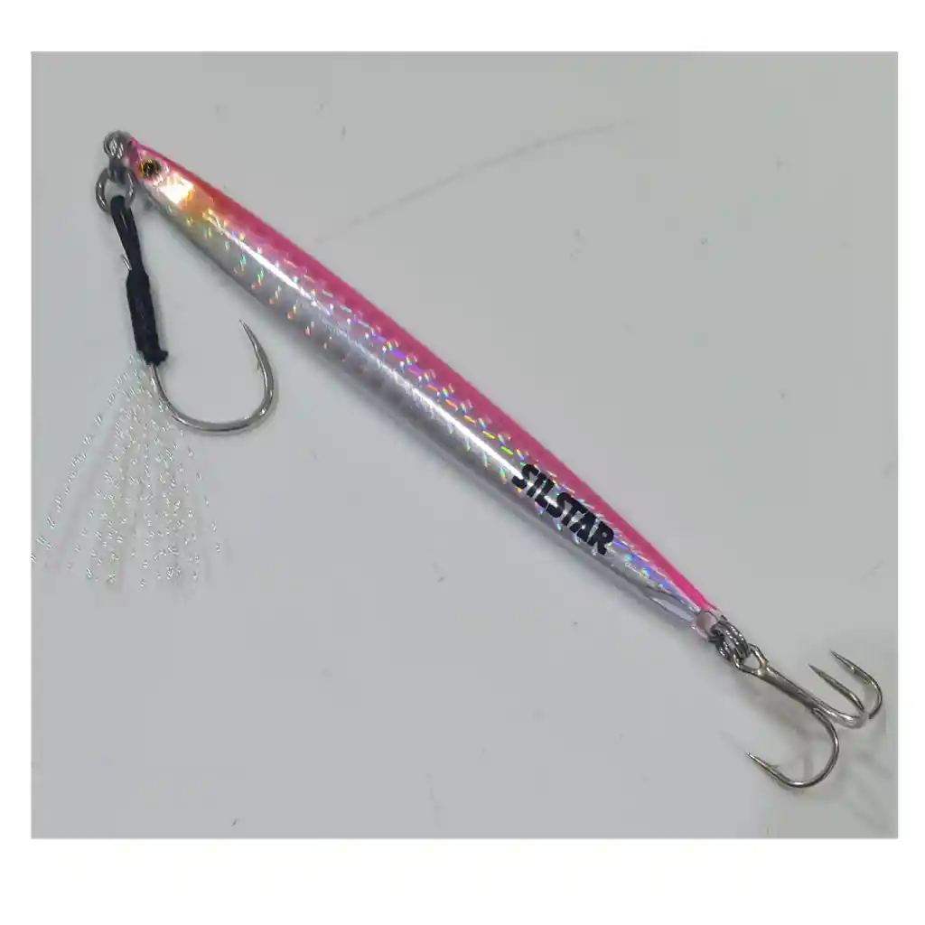 SEÑ SILST 10c 30g PROF FCS/PRL Señuelo JIG o chispa Marca Silstar Modelo PEN BAIT con dos anzuelos y fibras Color Lomo Fucsia Inferior Perla Lateral linea azul prismada Agalla Amarilla Fibra Stream verde brillo Ojo negro sobre amarillo solo en un lado Anzuelo simple nro 15 con fibra stream adelante Anzuelo triple nro 6 atras Peso 30 gramos Tamaño 10+1+0,5 cms Material PLOMO recubierto en fibra Lados disimiles para generar movimientos eraticos Lados Disimiles tambien generan difernte refratacion de la luz para atraer a la presa Ojetillos en ambos extremos Ideal para lance contra el viento y larga distancia Venta por unidad