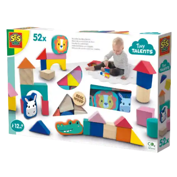 Este set de bloques de construcción de 52 piezas contiene bloques y formas de madera en colores modernos y bonitos. Los niños a partir de 1 año disfrutarán apilando los bloques y construyendo torres, casas y otras estructuras. Mediante el juego, desarrollarán conciencia espacial y habilidades motrices. Con las tres piezas con ilustraciones de cabezas de animales, los bloques pueden apilarse de muchas formas para una diversión sin límites.Cuando hayan acabado de jugar, los niños pueden guardar los bloques en la práctica bolsa de almacenaje. Se recomienda de 12 meses en adelante.