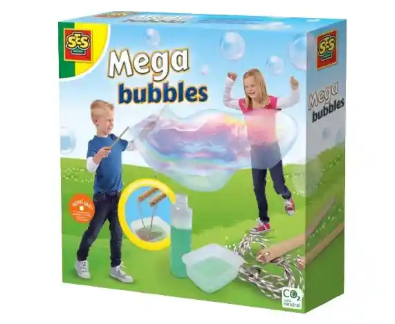 Hacer burbujas ya no es como antes. Ahora puedes hacer megaburbujas usando esta práctica herramienta y una solución jabonosa superfuerte. ¿Cuán grandes puedes llegar a hacerlas? Sujeta los palos juntos y moja la cuerda en la solución jabonosa. Retírala otra vez y separa los palos con cuidado. Ahora tendrás una burbuja. Camina hacia atrás despacio y observa cómo la burbuja se hace cada vez más grande. Cuando sea lo suficientemente grande, vuelve a juntar los palos. La megaburbuja comenzará a flotar. ¡Mira lo lejos que vuela!. Sopla suave y brevemente en dirección a la burbuja grande (una bocanada corta) y observa si puedes crear una burbuja pequeña dentro de la grande. Se recomienda de 5 años en adelante.