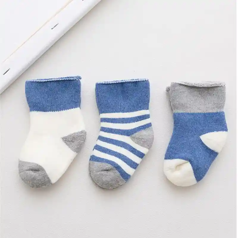 Hermoso set de calcetines ideales para otoño invierno para bebes de 0 a 6 meses en tonos azul! Características: Color: tonos azul Estilo: Casual Cantidad: 3 pares Tipo de Estampado: Color combinado Género: Unisexo Instrucciones de Cuidado: Lavado a mano o limpieza en seco profesional Material: Algodón Composición: 80% Algodón, 20% Poliéster Características de tamaño Talla: unitalla 0 a 6 meses Ancho: 6 cm Largo: 9 cm ❤Todos nuestros pedidos van siempre en presentación regalo listos, con una tarjeta para dedicar =) ❤