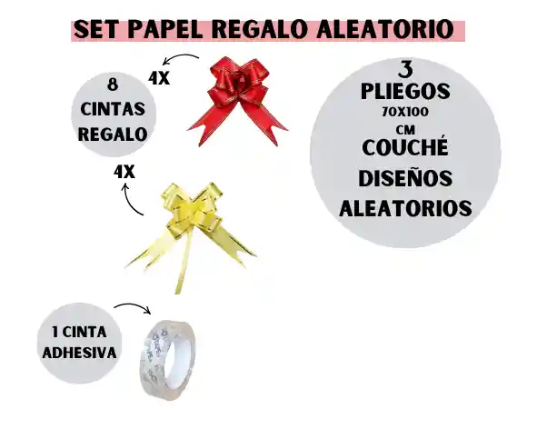 El set incluye 3 pliegos de papel de regalo navideño aleatorios entre los de las imágenes, 8 cintas de regalo (4 de cada color) y una cinta adhesiva. Todo para envolver tus regalos de navidad!