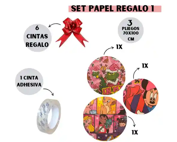 El set incluye 3 pliegos de papel de regalo navideño (los de la imagen), 6 cintas de regalo roja y una cinta adhesiva. Todo para envolver tus regalos de navidad!