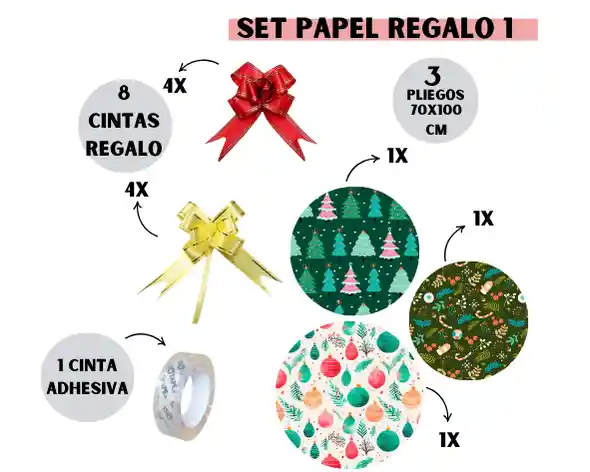 El set incluye 3 pliegos de papel de regalo navideño (los de la imagen), 8 cintas de regalo (4 de cada color) y una cinta adhesiva. Todo para envolver tus regalos de navidad!