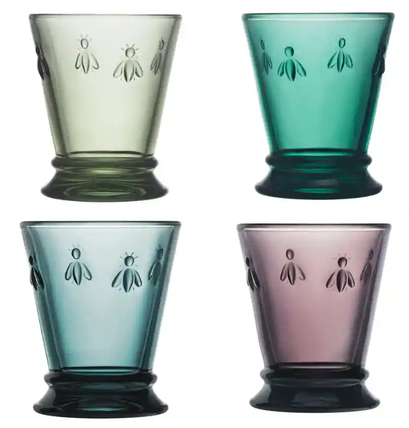 Esta colección icónica está adornada con el símbolo histórico francés de la abeja que alguna vez adornó las telas, cortinas, alfombras y muebles reales. Un azul dorado marroquí sirve como telón de fondo de esta nueva edición, inspirada en los emblemáticos iconos de las abejas conservados en el Museo Carnavalet de Francia. Después de más de 20 años, La Rochere da nueva vida a la historia de la colección Abeja con los vientos del Mediterráneo y Provenza a todo color. Las abejas y su color le dan un toque para que todos los días tengas algo que celebrar. Muchos de los productos La Rochere fueron diseñados en cooperación con diseñadores y se basan en las formas tradicionales de las colecciones de vidrio del siglo XIX, por lo que tendrás auténticos clásicos franceses en tu mano. Cuenta con el símbolo de Napoleón de l'abeille, la abeja, recordando un momento en la historia de Francia. Las encantadoras abejas y la silueta pura y moderna de la colección, hacen que este set ultra versátil sea perfecto tanto para celebraciones casuales, como para el uso diario Producto apto para lavavajillas <h3 class="upper">Características: Material: VidrioMedidas: 10 cm de alto x 8,5 cm de diámetroCapacidad: 240 mlPaís: Francia