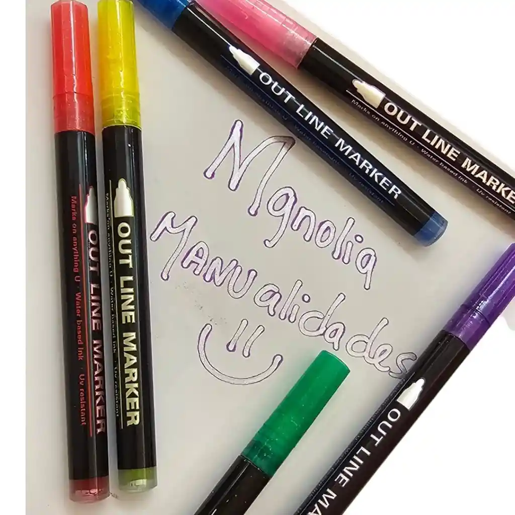 Marcadores de doble línea con tecnología de tinta de pigmento. Al contacto con el papel, el marcador separa el color del pigmento plateado, creando un efecto de contorno automático. Su fórmula resistente al agua garantiza una mayor durabilidad en diversos proyectos de papelería. Especificaciones técnicas: Cantidad: 6 unidades. Tipo de tinta: Base de Agua/pigmento (Resistente al agua). Efecto: Centro plateado metálico con borde de color. Punta: Fibra resistente para un flujo constante. Superficies: Ideal para papel de alto gramaje, cartón y manualidades.