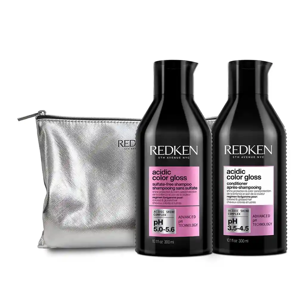 Set Acidic Color Gloss de Redken: shampoo y acondicionador que prolongan el color y aportan brillo tipo espejo + estuche de regalo. Ideal para cabello teñido, opaco o sin vida. Resultados visibles desde el primer uso.
