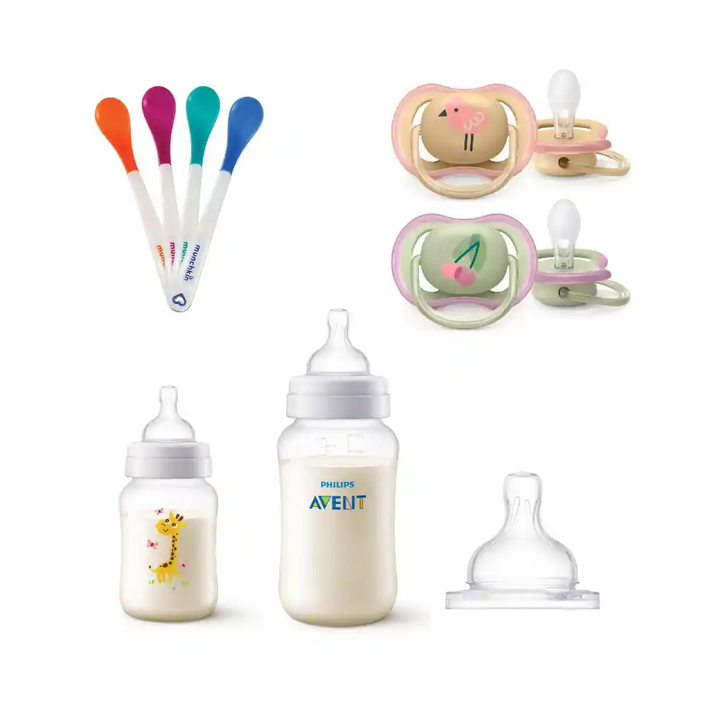 Set Avent Mamaderas Anticolic-chupetes-cucharas Térmicas Pack de regalo perfecto, tiene todo lo necesario para la alimentación en los primeros meses de vida de tú bebé. Contenido: 1 Biberón de cuello ancho 330ml/11oz 1 Biberon de cuello ancho 260 ml/ 9oz 1 Tetina Anti-Colic 6+ Flujo rapido 2 Chupetes de 0-6 meses 4 Cucharas con sensor de temperatura SET DE MAMADERAS ANTICOLICOS 330 ml, 260 ml y tetina Clínicamente comprobado que reducen los cólicos y los malestares.* Set de 3 piezas: 1 Biberón de cuello ancho 330ml/11oz 1 Biberon de cuello ancho 260 ml/ 9oz 1 Tetina Anti-Colic 6+ Flujo rapido Con válvula anticólicos diseñada para mantener el aire lejos de la pancita del bebé para reducir el malestar 60% menos malestar durante la noche* Tetina con textura acanalada que evita la contracción permitiendo una alimentación ininterrumpida Antigoteo para una alimentación agradable Cuello ancho y menos piezas para facilitar la limpieza y el montaje Forma ergonómica para sujetar fácilmente 0% BPA Compatible con toda la gama Philips Avent y con las tetinas de diferentes niveles de flujo Origen: Brasil. * Los bebés de dos semanas alimentados con mamaderas Philips Avent presentaron menos cólicos y una reducción significativa de la irritabilidad durante la noche, que aquellos alimentados con mamaderas de otras marcas. SET 2 CHUPETES ULTRA AIR 0-6 m Un chupete liviano que favorece la respiración Los orif. de vent. de gran tamaño permiten que la piel del bebé respire Tranquilice a su bebé con un chupete que permite que su piel respire. La colección ultra air de Philips Avent tiene orificios de gran tamaño para mantener la piel seca. Su cubierta liviana está diseñada para un flujo máximo de aire. Está disponible en varios colores y diseños. Mantiene la piel del bebé suave y seca Deja que la piel respire Esterilícelo y guárdelo en una práctica funda Esterilice y almacene en un estuche práctico Tetina de textura sedosa que ofrece la máxima comodidad Amado por bebés en todo el mundo. La textura ideal para una sensación de comodidad Respeta la forma natural del paladar, los dientes y las encías Fashionable colors and designs Colores y diseños modernos 4 CUCHARAS CON SENSOR DE TEMPERATURA Sistema patentado de detección de calor: punta de cuchara se vuelve blanca cuando la comida del bebé es demasiado caliente (aproximadamente 110 F y más. Tazón de cuchara estrecha es cómodo para bocas pequeñas, y puntas blandas son suaves en las encías. Mangos largos para una mejor alimentación en sillas altas. Sin BPA ni ftalatos apto para colocarlo en la charola superior del lavaplatos.