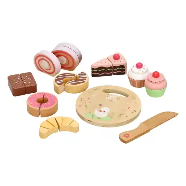 Set Contiene 10 Unidades. (1 Tabla 1 Cuchillo de Madera y 8 Pastelitos). Ideal Para Jugar a Cocinar y Cortar Pastelitos Debido a su Velcro Que Permite Cortar y Pegar. Ideal Para Mayores de 3 Años