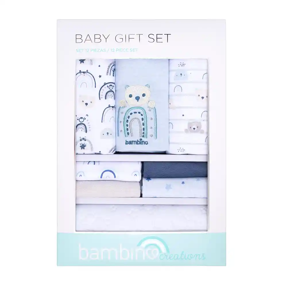 La linda y práctica Caja de Regalo Bambino es ideal para regalar en baby showers y ocasiones especiales. Características: Cada set incluye: 3 mantitas de 76x76 cm, 8 toallitas de limpieza para bebé de 23x23 cm y 1 mudador de 46x69 cm. Todos son accesorios indispensables en el bolso de una mamá.