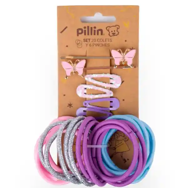 Set Pillín Contiene 26 Unidades. Colets 20 Und + Pinches 6 Und. En Tonos Morados y Rosados Este es Uno de Los Favoritos de Nuestras Pequeñas Clientes Aman Las Mariposas y Sus Colores. Úipo de Producto: Pinches & Cintillos Color Multicolor Ocasión: Casual Composición: Goma 20.0% Poliéster 40.0% Hierro 40.0%. Pay137-23Sur Temporada: Verano Cuidados: Lavar a Máquina Max 30° C Con no Unsar Cloro no Usar Secadora Lavar Por Separado o Con Colores Similares Diseñado Por Nuestro Equipo Chileno de Diseñadoras. Pillín es Una Marca Chilena Con Más de 60 Años en el Mercado Por lo Que ha Podido Acompañar a Muchas Generaciones Durante su Crecimineto.El Pillín Nos Encanta Ser Niños!