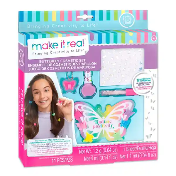 El set de maquillaje Butterfly Dreams Cosmetic Set de Make It Real es un regalo perfecto para cualquier niña a la que le encante la belleza y la moda. Este set contiene todo lo que necesitan para crear un look de maquillaje y peinados únicos y llamativos. Incluye 6 pinzas para el cabello con diseño de mariposa, que son perfectas para crear peinados elegantes y divertidos. También incluye una botella de esmalte de uñas, que viene en un hermoso color rosa brillante y una hoja de pegatinas para uñas, con las que pueden decorar sus uñas ya que tienen diseños de mariposas y flores. Para completar el look, el set incluye 1 tubo de brillo labial y 1 brillo labial sólido que son perfectos para darles un toque más de color a sus labios. Este set de cosméticos butterfly dreams permite dejar volar la imaginación y crear looks de belleza que las harán sentir únicas y especiales.