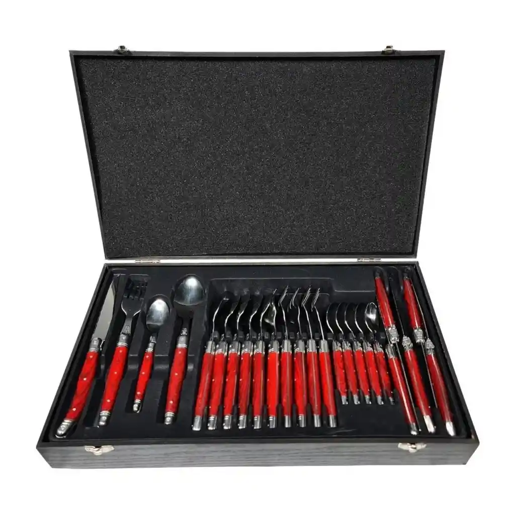 Elegante juego de cubiertos de acero color rojo, dese el gusto de tener un juego de cubiertos con estilo y buen diseño. La calidad y la belleza de este elegante juego de cubiertos invita a compartir, su diseño se adapta a cualquier estilo, y dará un toque clásico a cualquier celebración. Material: Acero Color: Rojo Medidas: 4x30x40 cm Incluye: 6 cuchillos 6 tenedores 6 cucharas 6 cucharas de té Caja de madera Material: Acero y mango plástico Producto 100% recomendado. Garantía Legal de 6 meses.