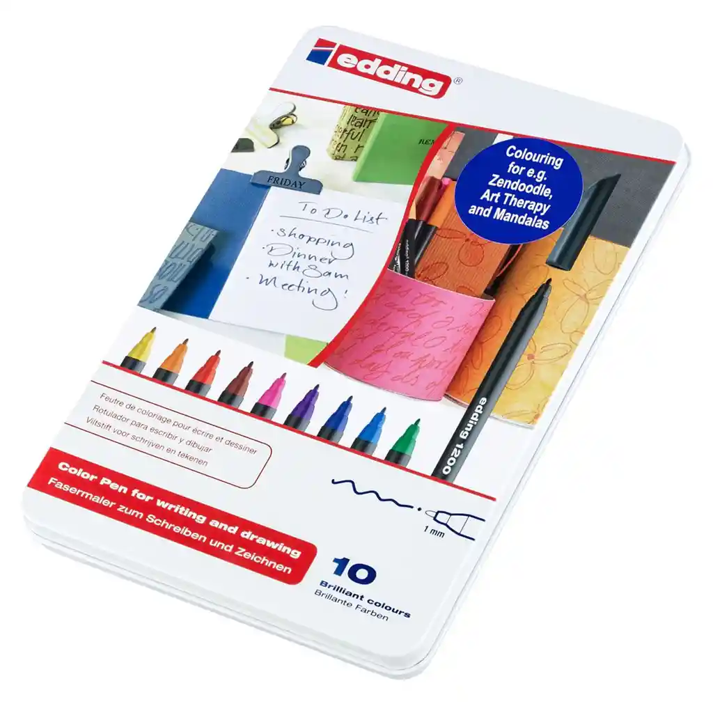 Set de 10 Marcadores de fibra Edding 1200 Colores surtidos Forma de la punta: punta redonda, grosor de trazo: 1 mm, olor neutro, fluorescente, secado rápido, tinta especial previene el sangrado a través del papel, capuchón puede reposicionarse.