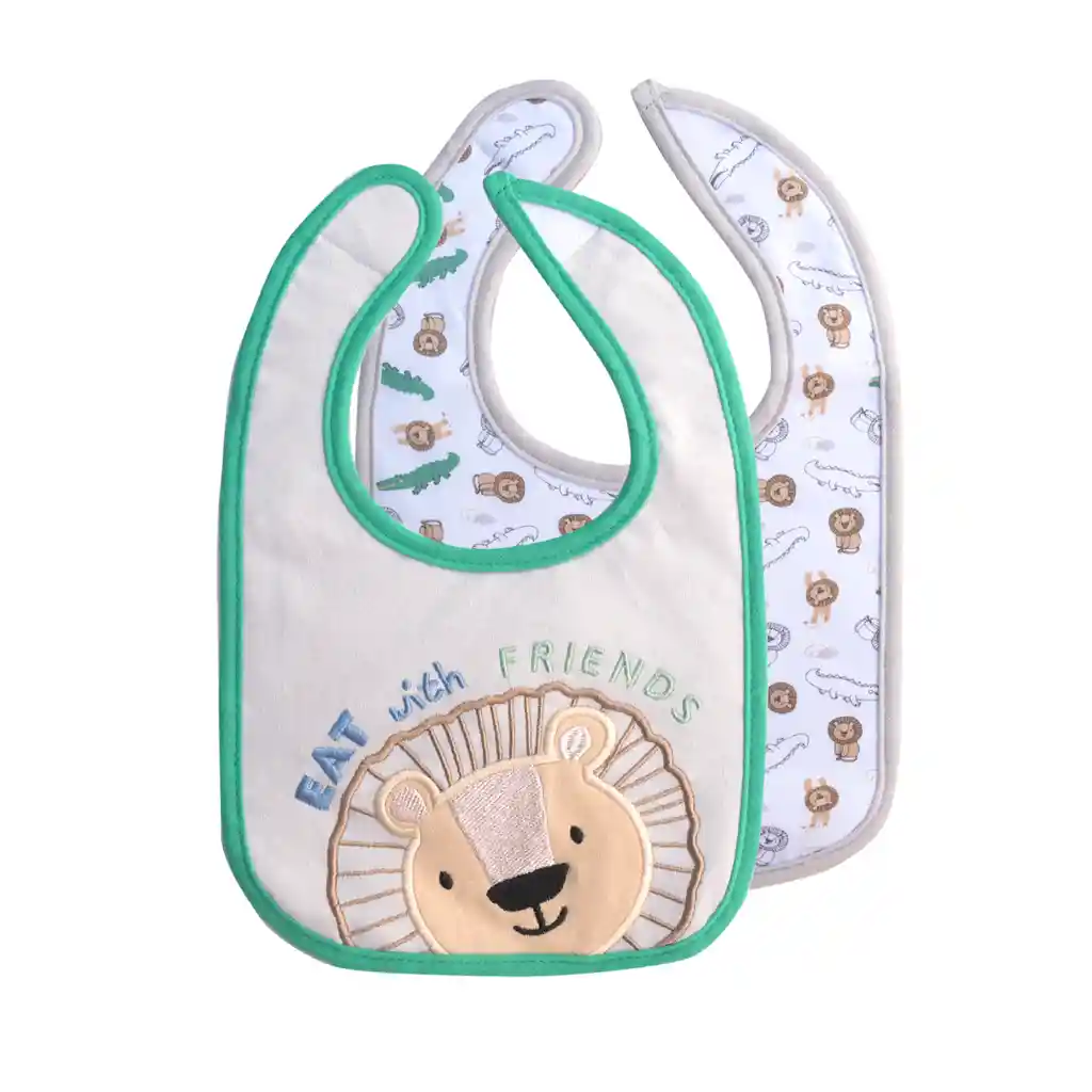 Set que incluye 2 baberos con interior de plástico Impermeables y fáciles de lavar Material exterior 100% de Algodón e interior de plástico Cierre de Velcro. Diseño Leon