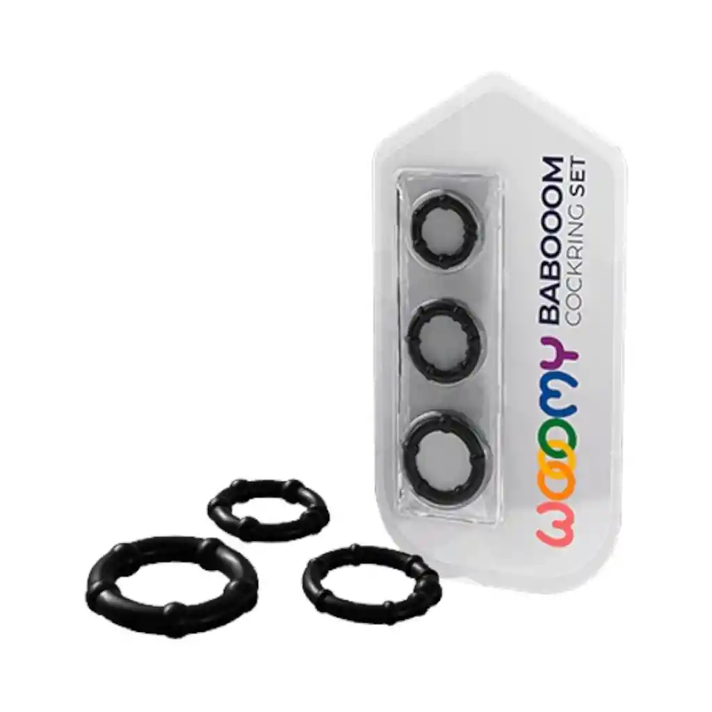 Babooom Cockring Set es un kit de 3 anillos estranguladores con diferentes tamaños que se ajustan a la forma del pene. Son ideales para potenciar las erecciones, ayudan a controlar la eyaculación precoz y puedes usarlos de forma individual o conjuntamente para un efecto más pronunciado. Mejora tu rendimiento sexual y obtén eyaculaciones más potentes. Los 3 anillos para pene deben ir colocados en su sitio, aunque depende del tamaño de cada uno, el más pequeño, irá a lo largo del pene (como más cerca del glande, más placer), el mediano recoge los testículos y el grande se coloca en la base del pene. Características: Contenido: Set de 3 anillos. Color: Negro. Material: TPE. Ofrece erecciones duraderas y más potentes. Ideal para controlar la eyaculación precoz. Textura suave. Posee esferas para mayor estimulación. Resistentes al agua (Sumergible). Dimensiones: Diámetros 2 / 2,2 / 2,5 cm. Peso: 0,023 g. Observaciones: Usar por un máximo de 20 a 30 minutos por acto.