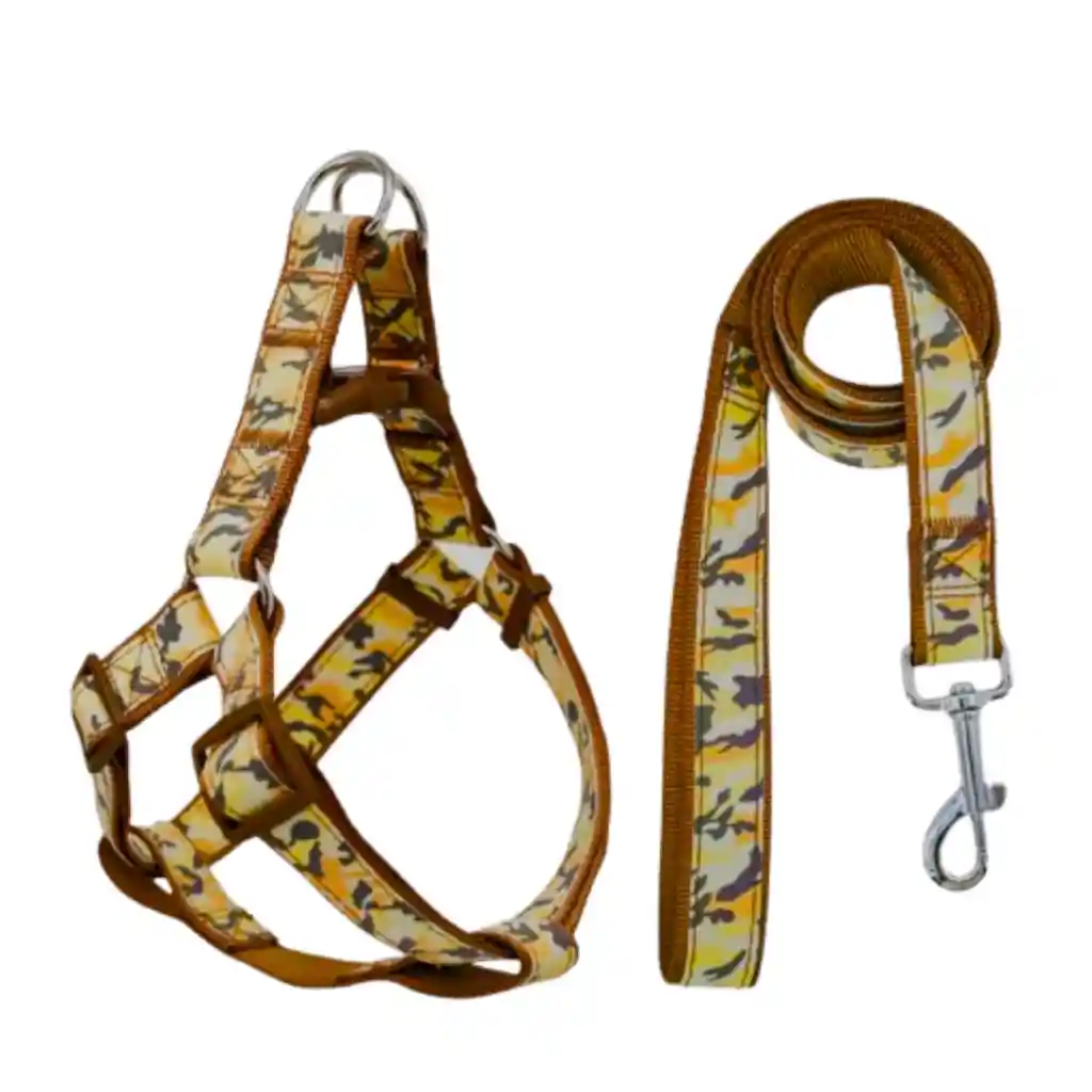 - Juego de arnés y correa para perros Medianos y Grandes - El arnés es ajustable, fácil de fijar para apretar y aflojar - La correa mide 1,20 cm - El conjunto completo es reflectante, para una mayor seguridad durante los paseos nocturnos - Su gancho mosquetón, es giratorio en 360° para evitar enredos Diseño: Camuflaje Color: Café